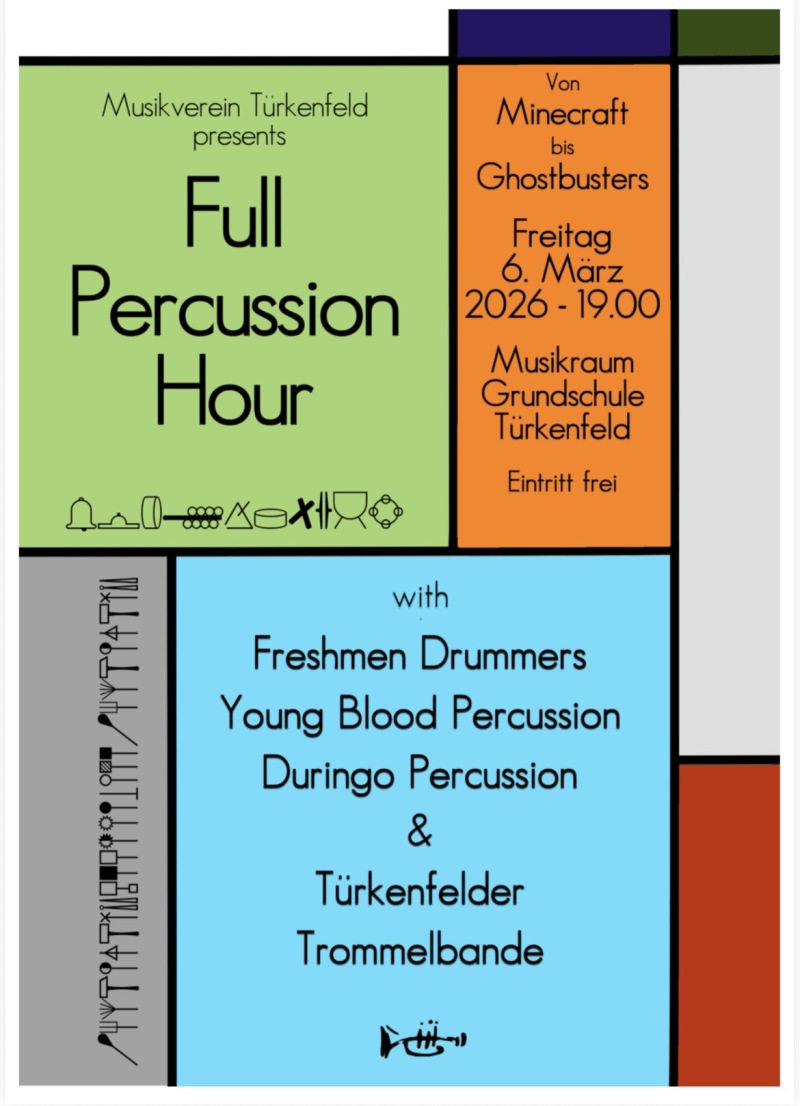 Am Freitag, 6. März 2026 um 19:00 Uhr präsentieren mehrere Percussion-Ensembles im Musikraum der Grundschule Türkenfeld ein abwechslungsreiches Programm. Das Publikum erwartet eine musikalische Reise von Minecraft bis Ghostbusters – bekannte Melodien und spannende Arrangements, umgesetzt ausschließlich mit Schlaginstrumenten.
